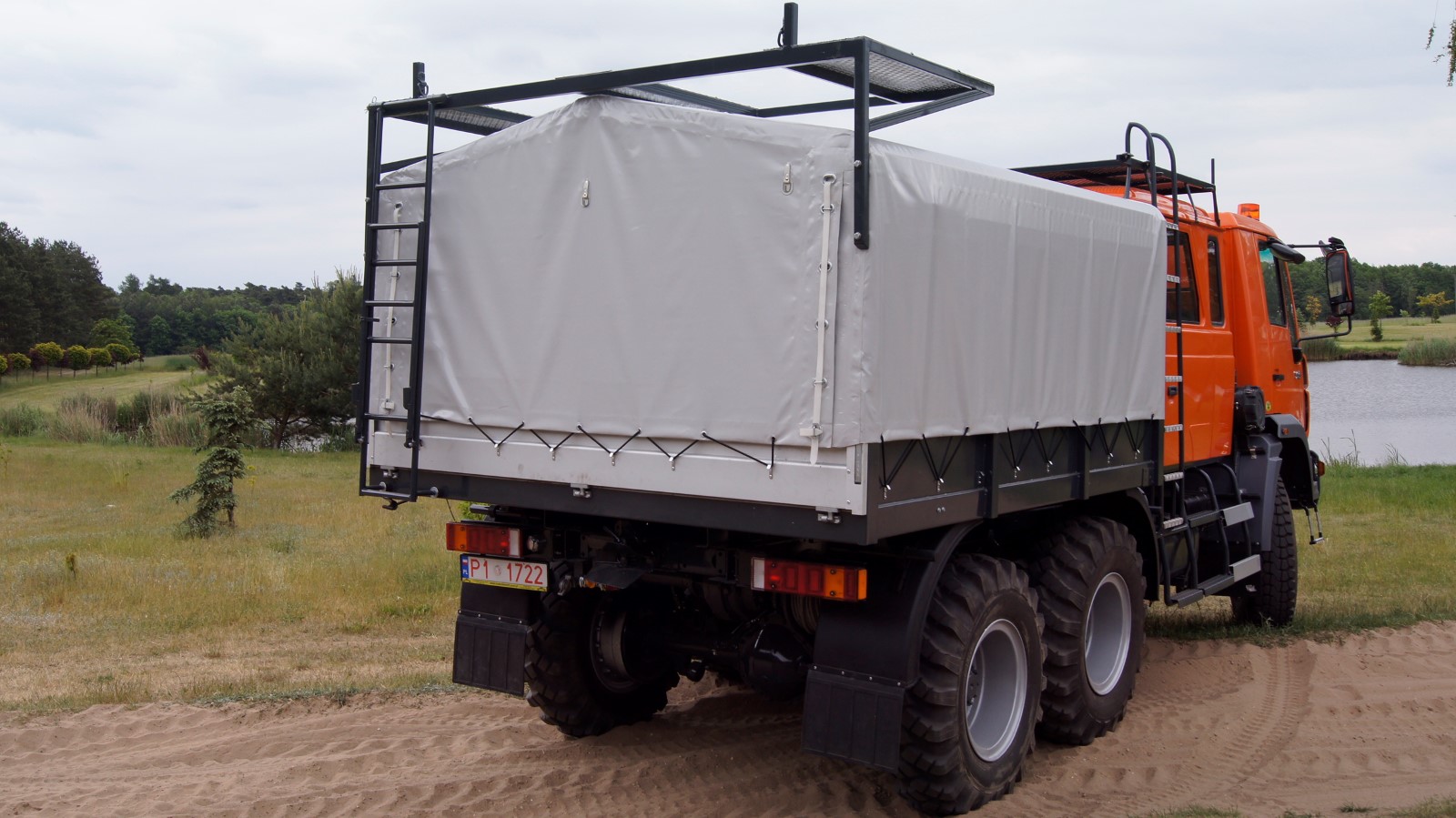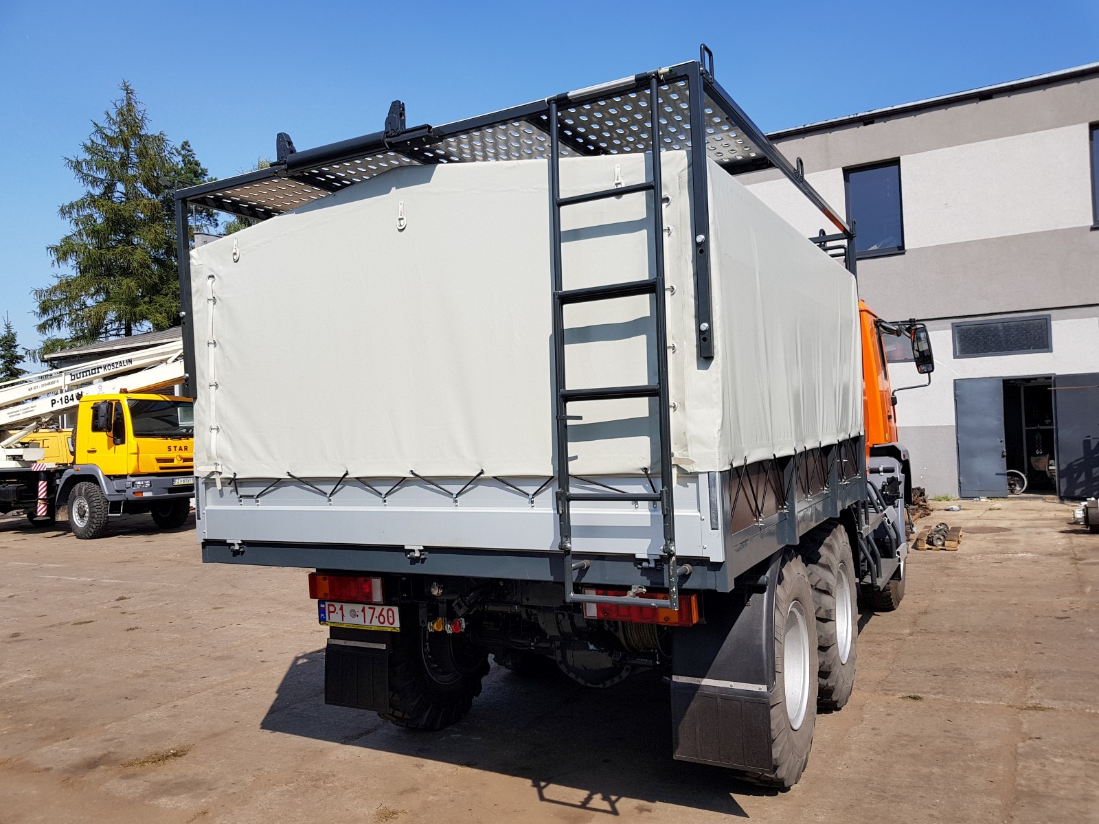 Skrzynia ładunkowa z plandeką oraz tylną burtą, wyłożona płytą antypoślizgową.